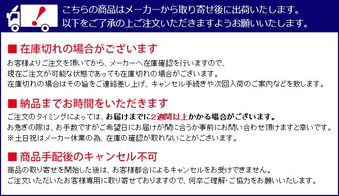 配送料値上げに伴い週1回程度まとめての取寄せになりますので、お届けまでに2週間以上かかる場合がございます。