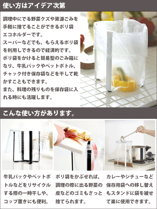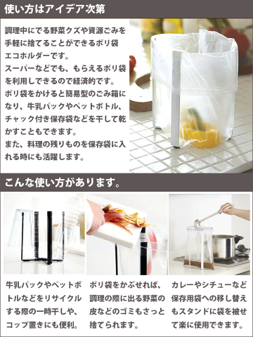 商品情報 ポリ袋を利用して調理中にでる野菜クズや資源ごみを、手軽に捨てることができるキッチンエコホルダー。